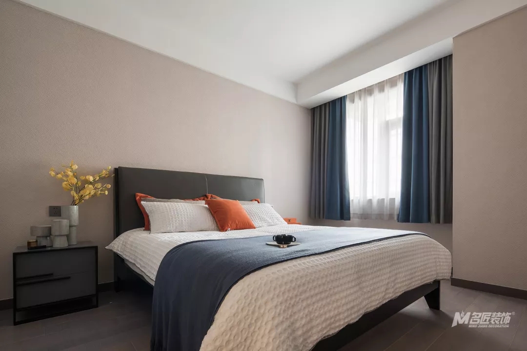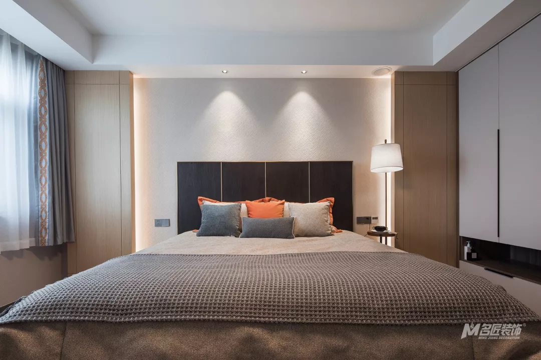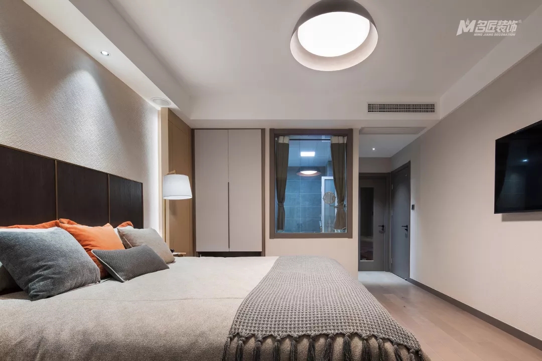 主卧的吊灯简约时尚,整个房间的设计简单但很有质感和品味。