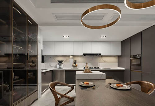 餐厅的灯极具设计感,是整个餐厅的点睛之笔,给沉闷的空间带来了一抹亮色,同时屋主并没有做餐厨一体的设计,而是巧妙的用“一门之隔”将两个空间区分开来,很好的避免油烟扩散到客餐厅。